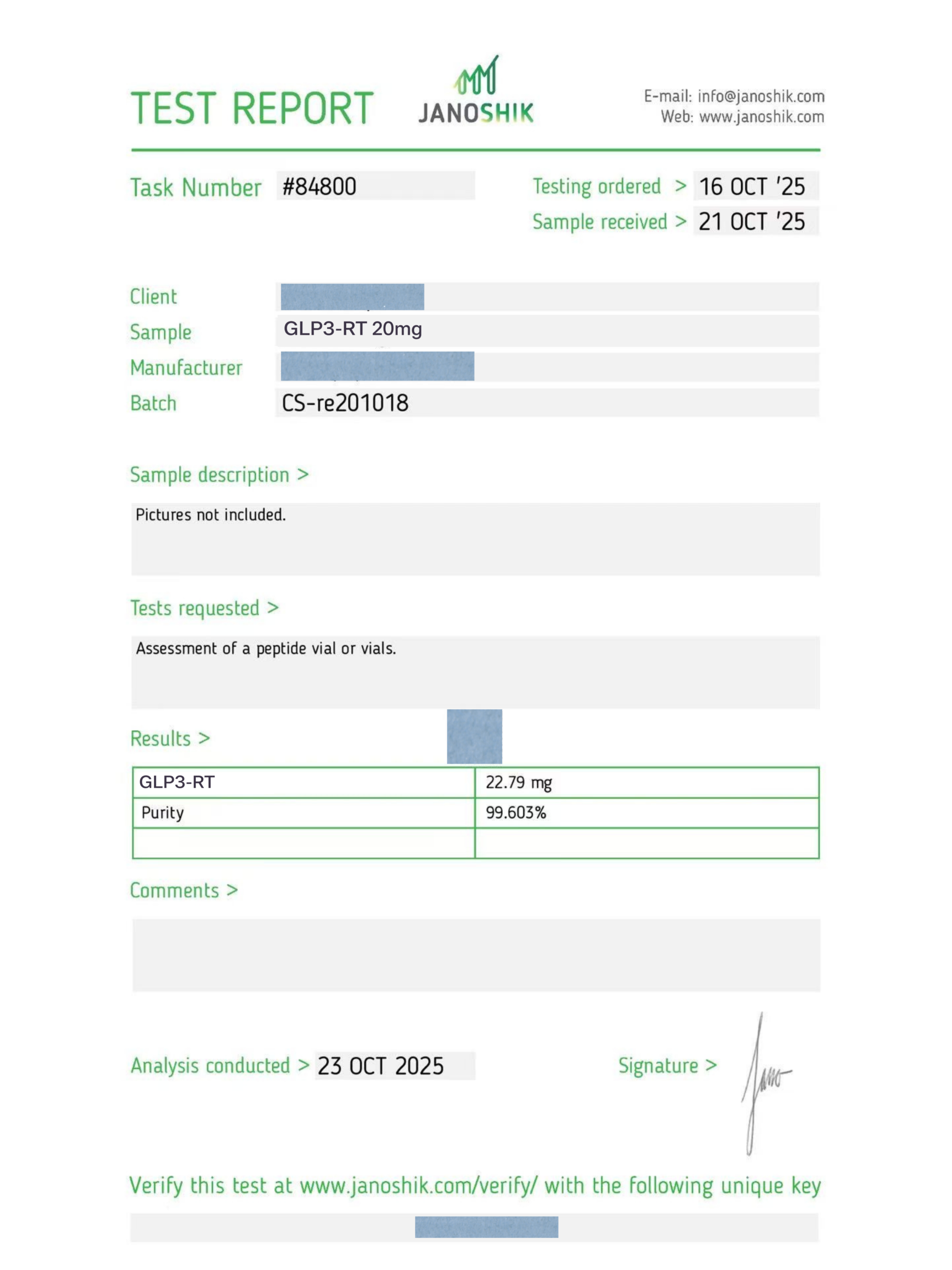 Contents:20 mg lyophilized (freeze-dried) powder provided in a 3 ml vial, sealed and sterile. Purity exceeds 99%, guaranteed.