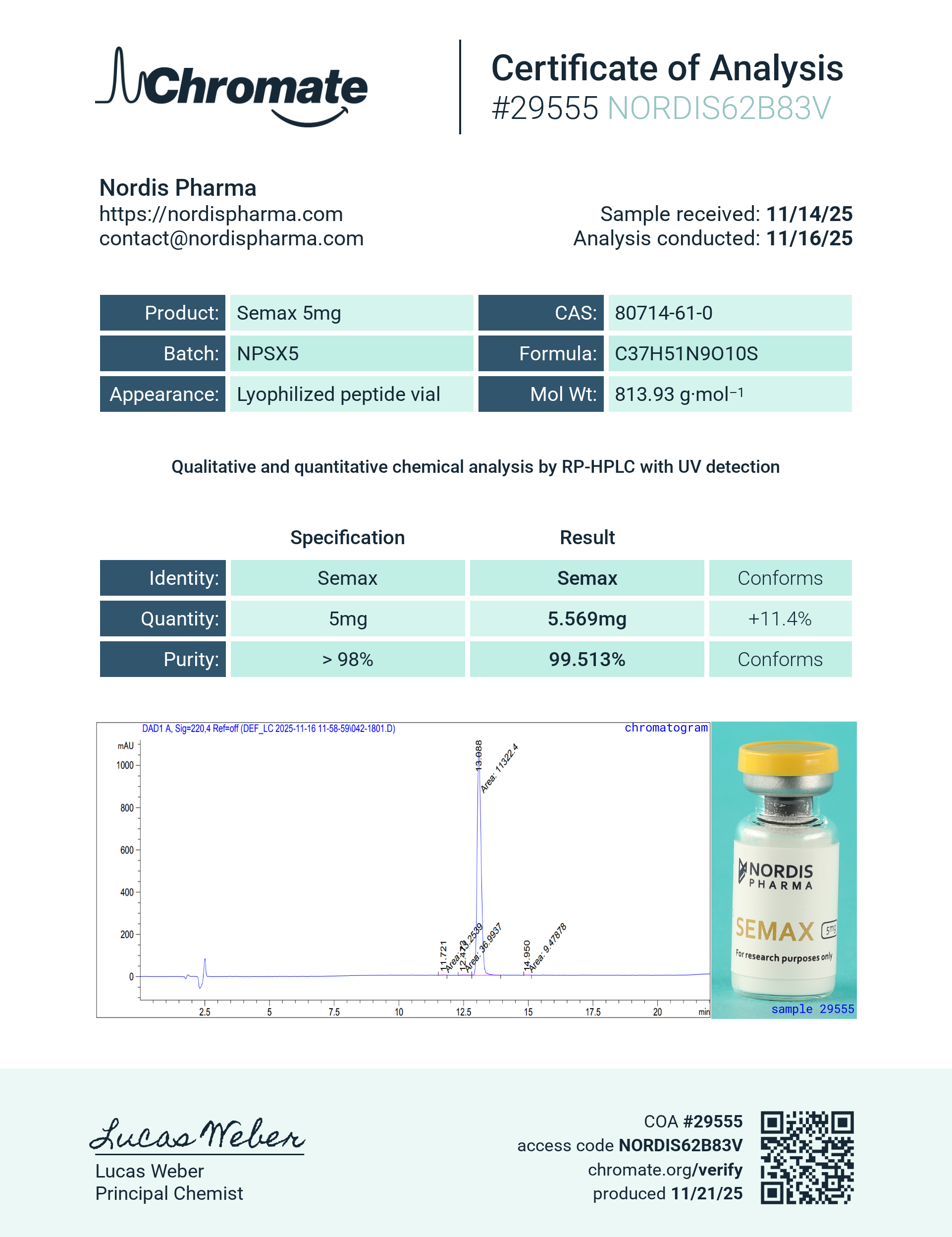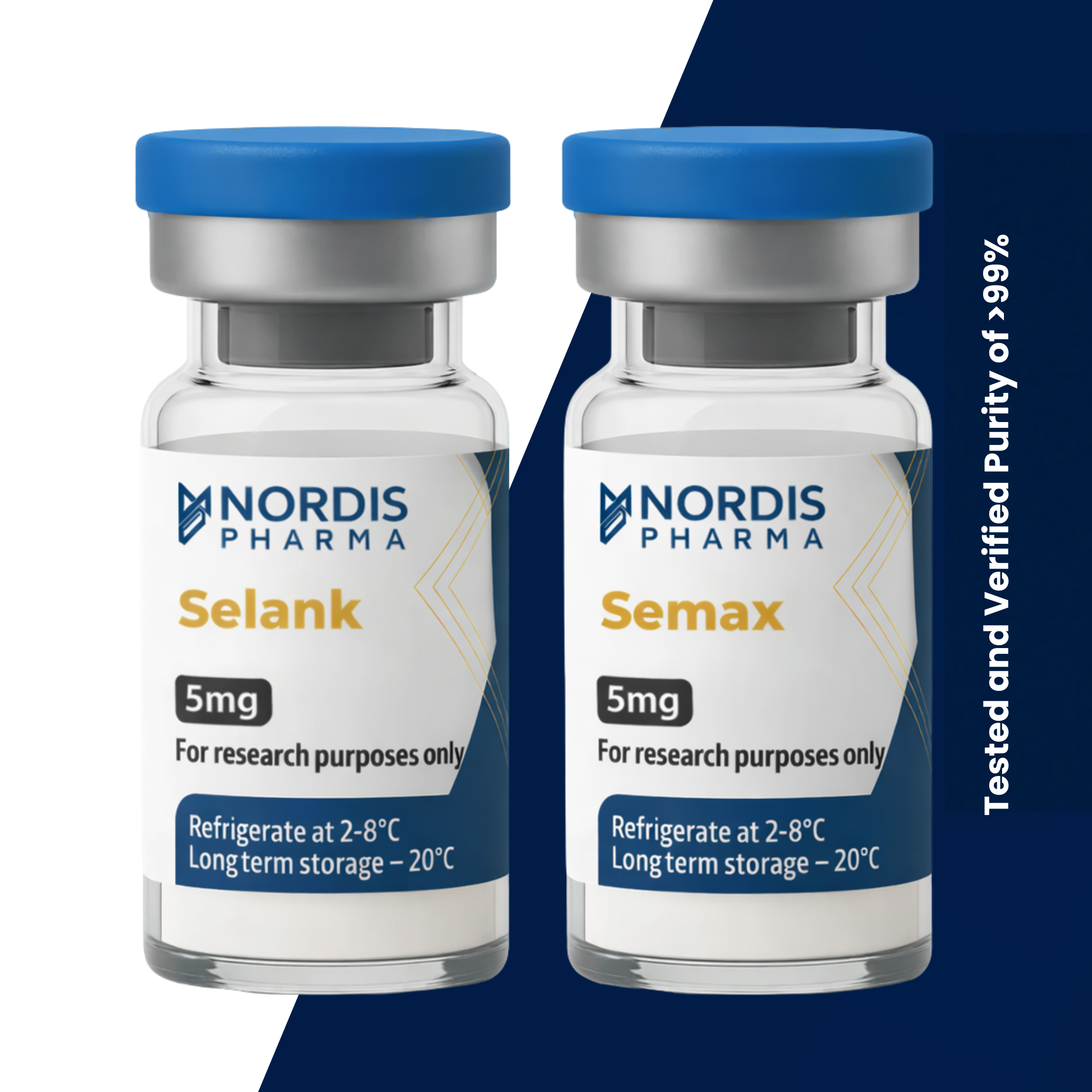 To preserve purity, accuracy, and biological activity, NordisPharma provides Semax and Selank in separate sterile vials, allowing each peptide to maintain: