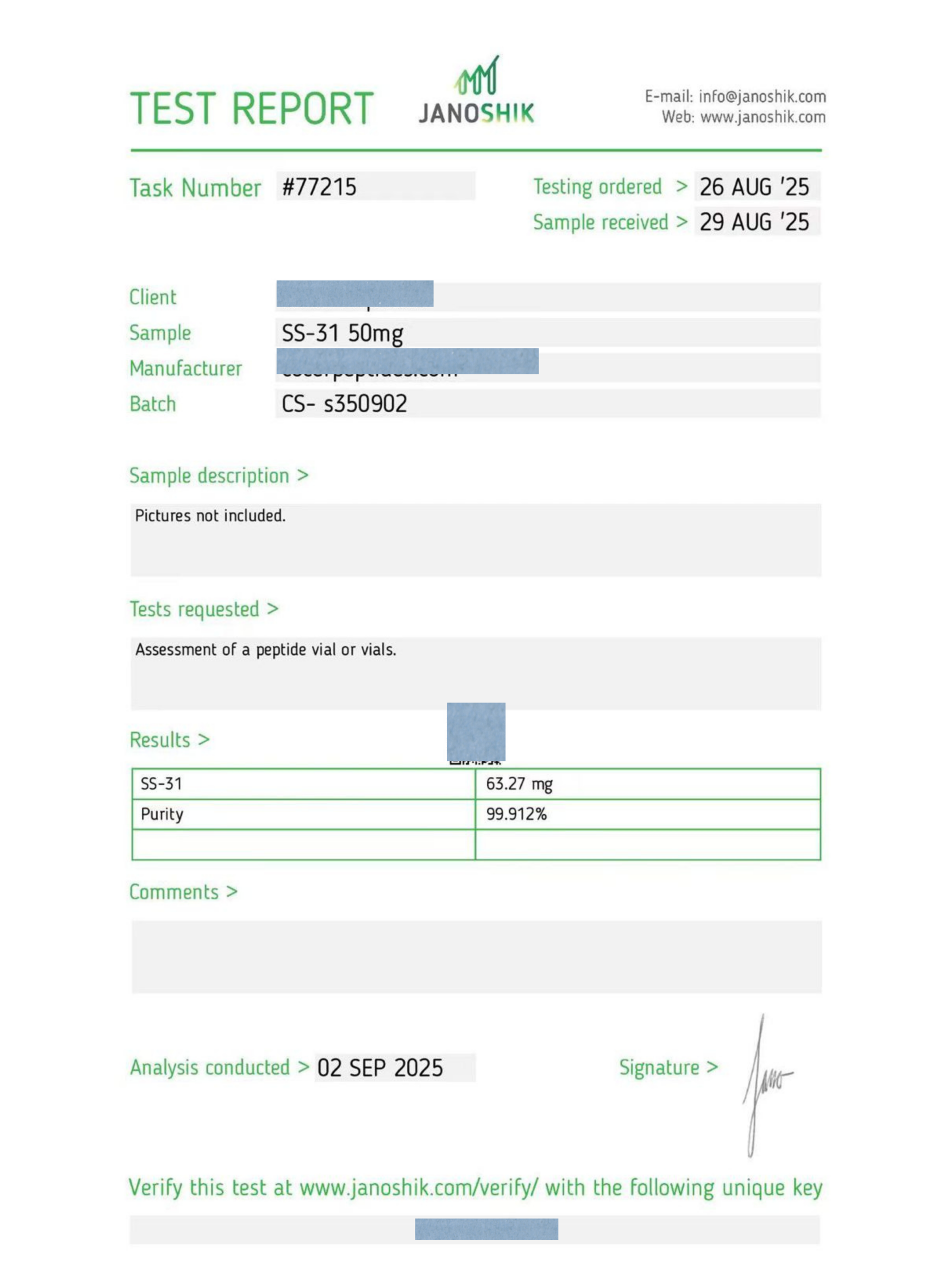 SS-31 (also known as Elamipretide) is a mitochondria-targeting peptide that selectively binds to cardiolipin within the inner mitochondrial membrane. This helps stabilize mitochondrial structure, reduce oxidative stress, and improve ATP production. SS-31 is widely researched for its role in mitochondrial repair, cellular longevity, and tissue recovery.